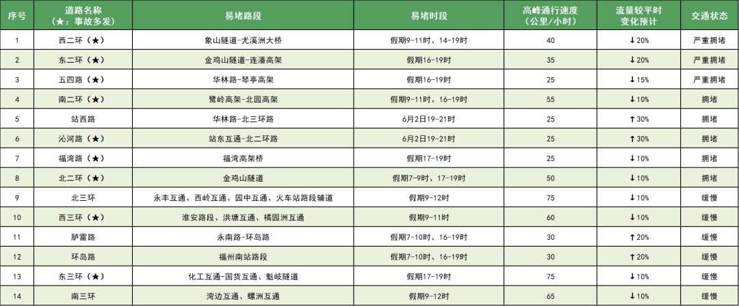 城区8条主要进出城通道日均交通流量预计较日常上升10%。拥堵路段集中在祥谦(螺洲互通-祥谦收费站)、福州南(双湖互通-福州南收费站、355国道六十份村路段、旗山大桥),拥堵时段集中在6月2日下午。