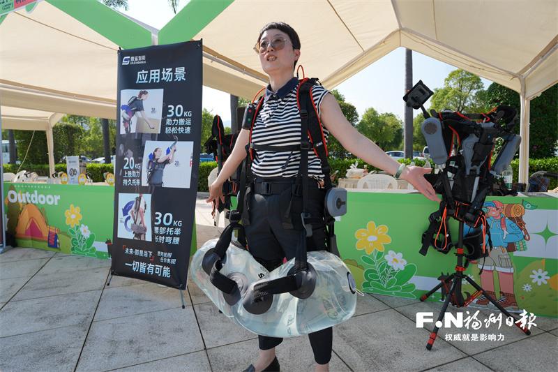 市民体验外骨骼穿戴装备,它可轻松提起30千克重物。记者 包华 摄