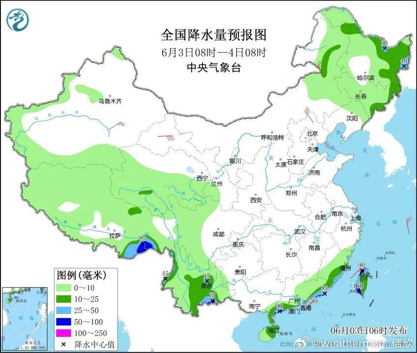 6月3日08时至4日08时,台湾岛、福建东南部、广东南部沿海、海南岛东部、云南西部和中东部、西藏东南部和北部、青海南部、内蒙古东部、黑龙江东部和北部、吉林东部等地部分地区有中到大雨,其中,西藏东南部、云南东南部、广东南部沿海的局地有暴雨,台湾岛西部的部分地区有暴雨或大暴雨(100~150毫米)。