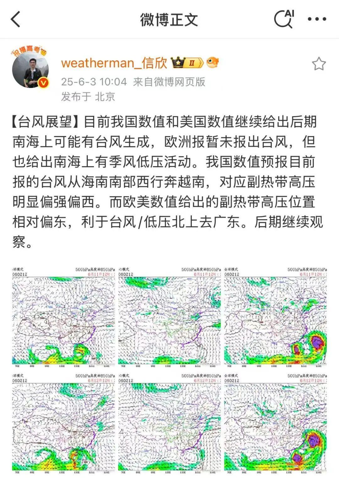 我国数值预报目前报的台风从海南南部西行奔越南,对应副热带高压明显偏强偏西。而欧美数值给出的副热带高压位置相对偏东,利于台风/低压北上去广东。后期继续观察。