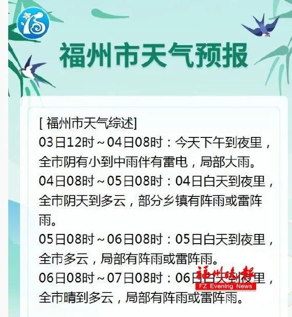 据福建气象:今天,全省阴,大部有阵雨或雷阵雨,南部地区部分中到大雨、局部暴雨。雷雨时局地伴有短时强降水、7~9级大风等强对流天气。4日,全省阴到多云,内陆地区部分有阵雨或雷阵雨。5日,全省多云为主,局部有阵雨。