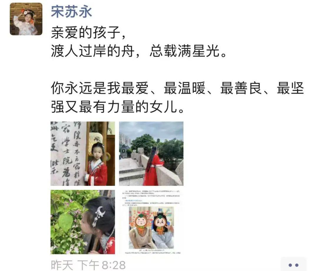 “亲爱的孩子,渡人过岸的舟,总载满星光”,在朋友圈里,宋苏永写道,“你是最坚强,又最有力量的女儿”。