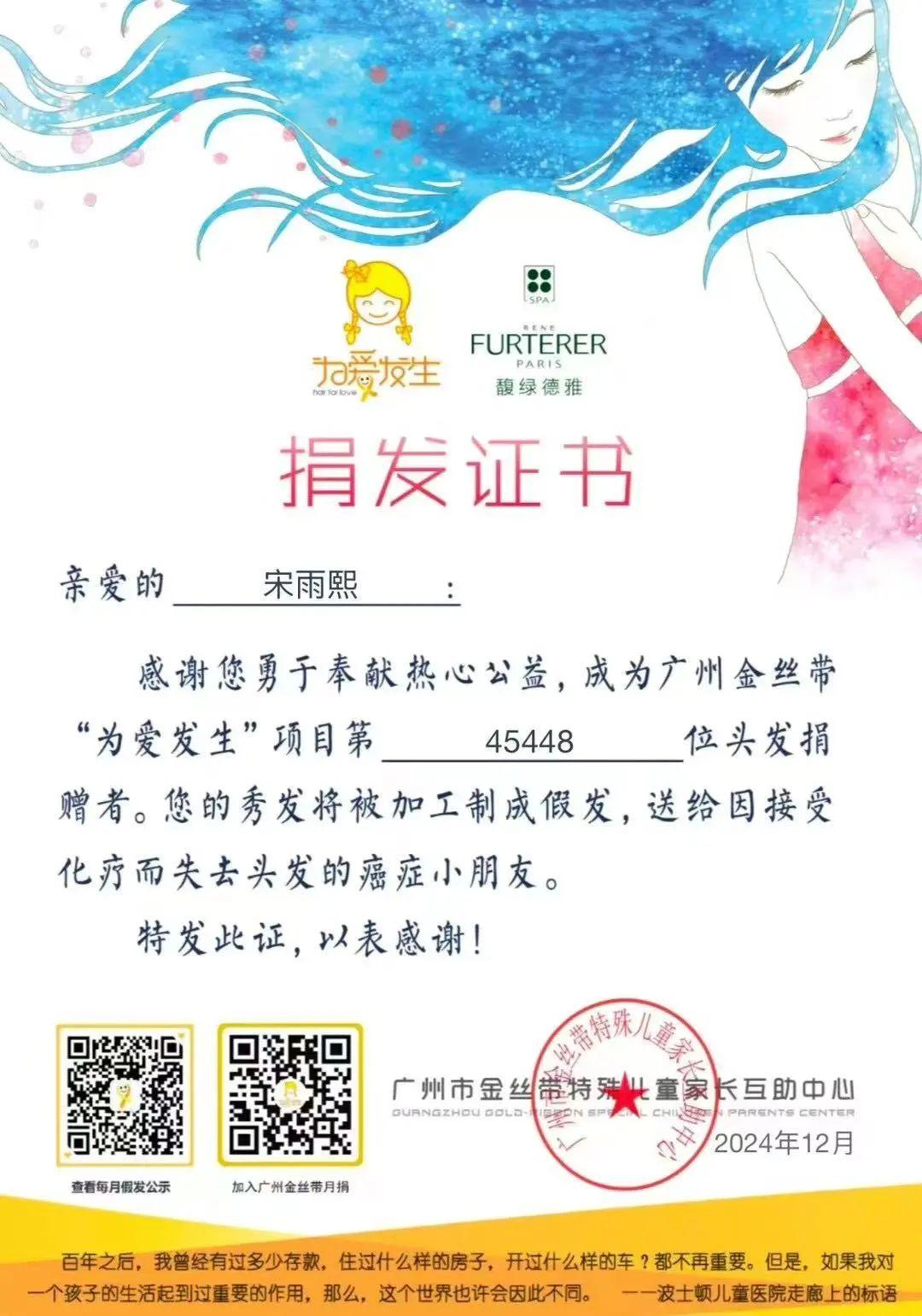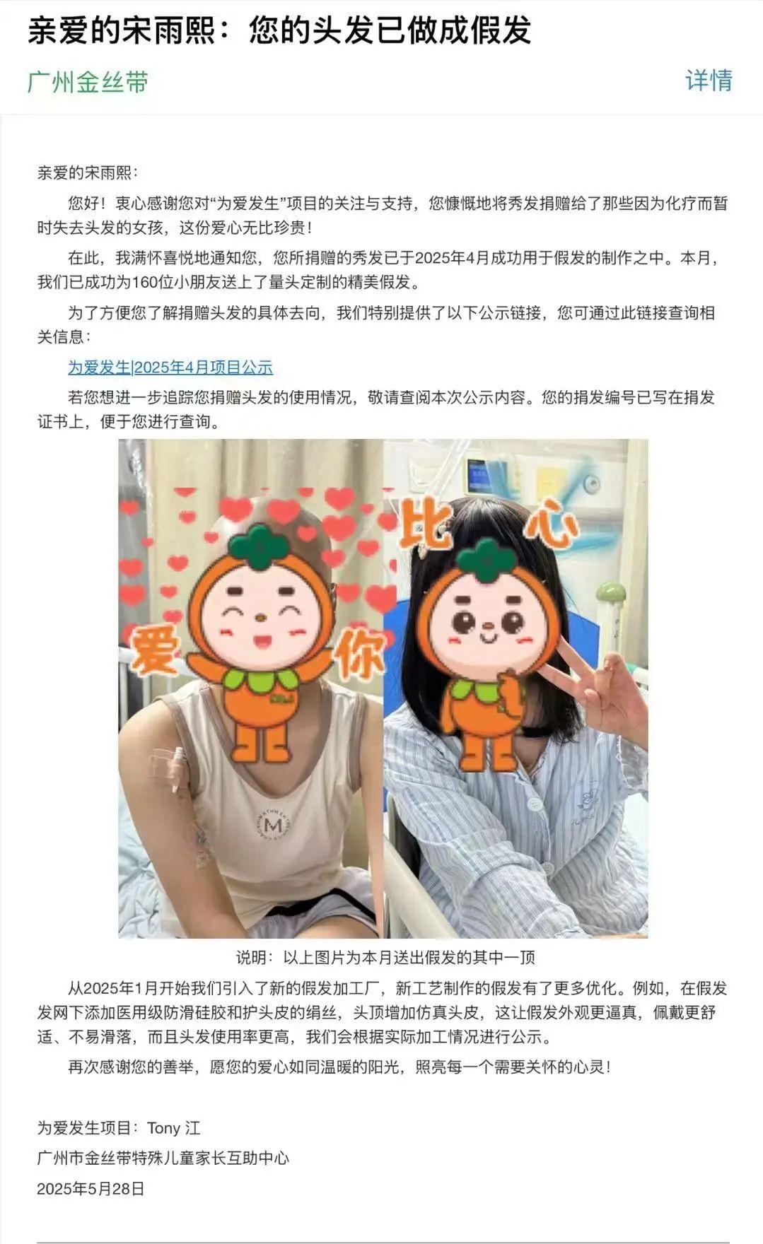 “亲爱的宋雨熙:您的头发已做成假发……您慷慨地将秀发捐赠给了那些因为化疗而暂时失去头发的女孩,这份爱心无比珍贵!”