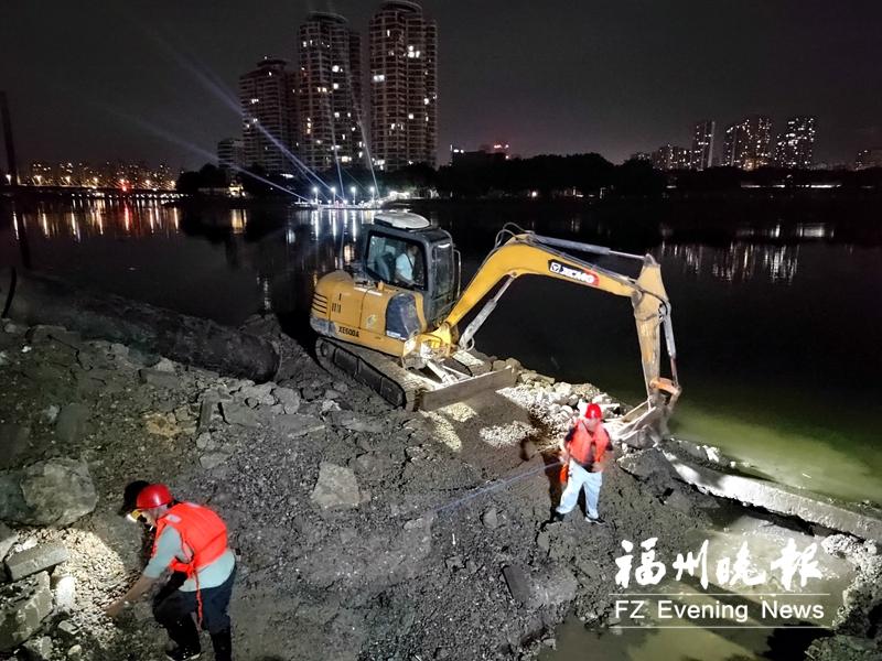 商家的灯光渐次熄灭,不远处的江水中,几束灯光却开始点亮。福州市水利局的工作人员穿戴好安全帽和防水鞋,顺着江坡来到江边的狭小工作面上,指挥挖掘机开始施工。