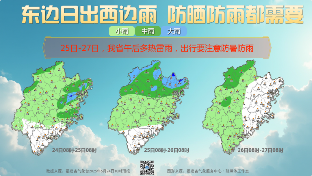 未来三天,受副热带高压控制,福建以晴热天气为主,午后有分散性热雷雨。25日,全省多云,大部有分散性阵雨或雷阵雨,北部部分中雨到大雨,局部暴雨。26日,全省多云,大部有阵雨或雷阵雨,内陆地区有分散性中雨,局部大雨。