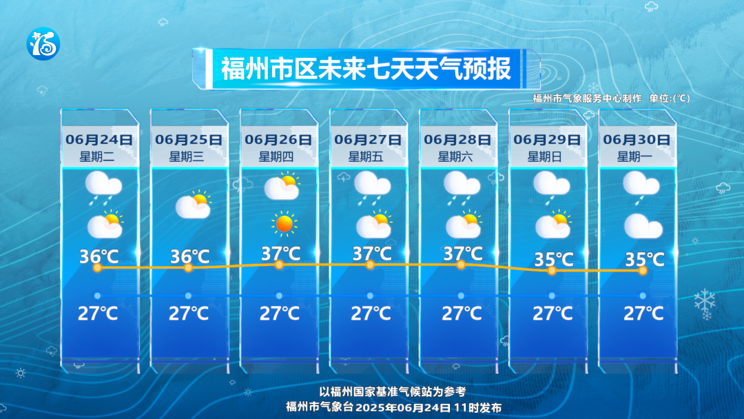 福州未来7天高温全勤,最低气温也有27℃左右,加上湿度较大,几乎全天候闷热。