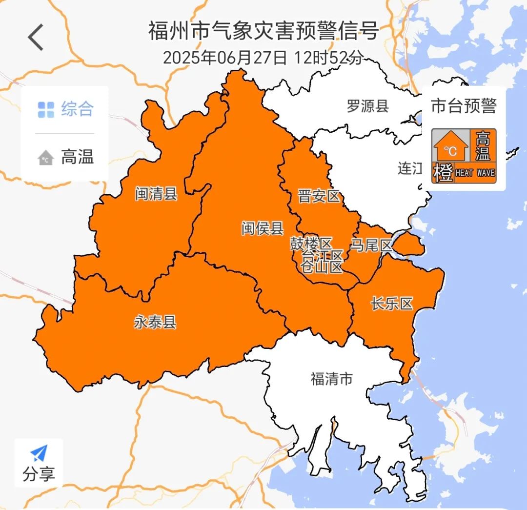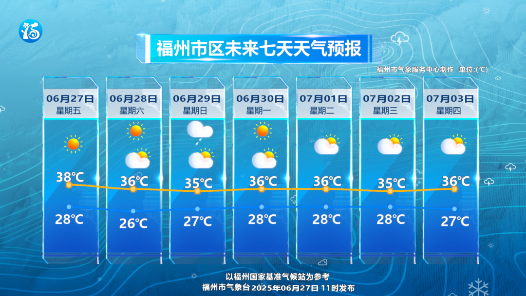 本周福州高温全勤,热浪持久且猛烈,高温橙色预警信号已经多日上班。这个周末,副高稍有减弱,高温略有下降,但福州市区总体还是热得很稳定,日最高气维持在35℃左右,夜晨气温在27℃上下,可以说热感贯穿全天候。
