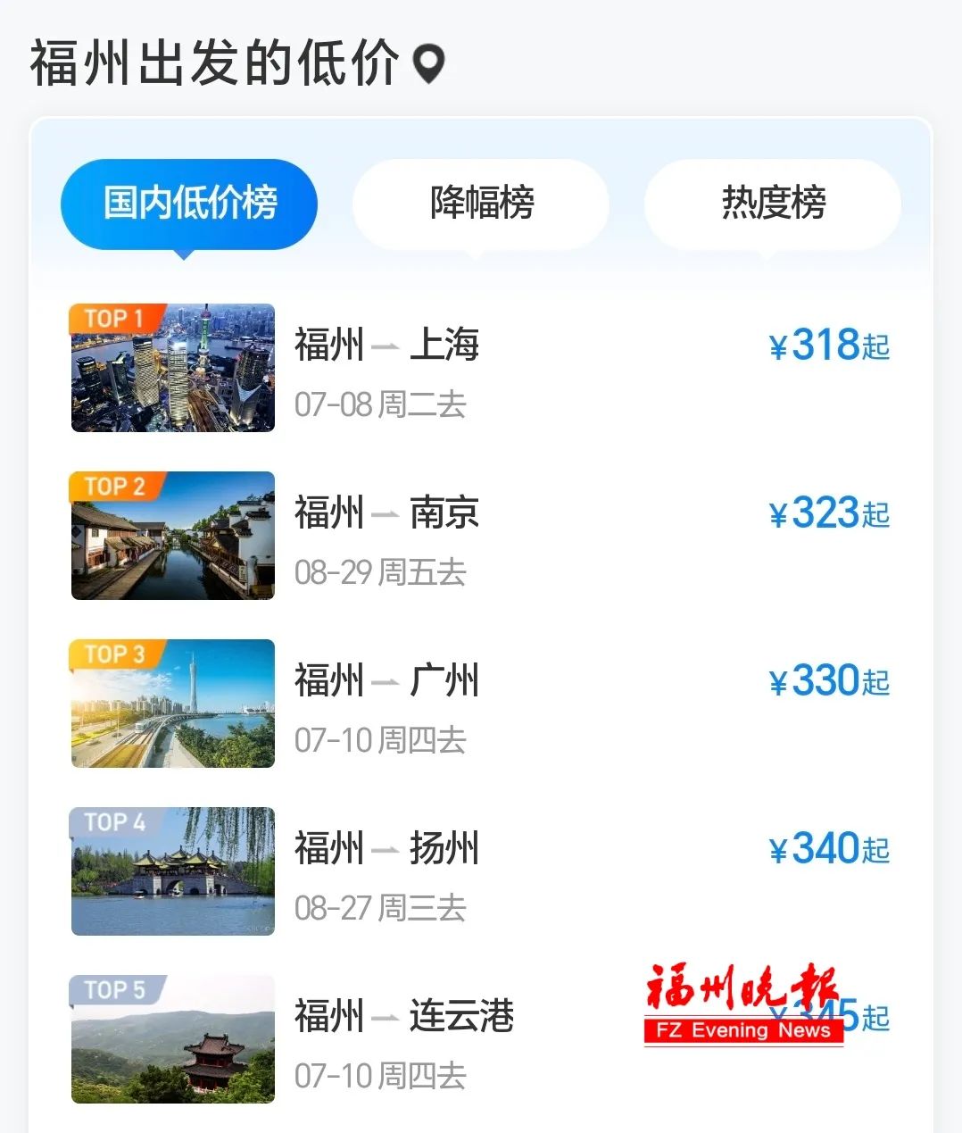 目前,福州飞南宁、常德的机票价格只要380元,飞长沙、武汉的价格只要400元上下,飞北海和青岛的价格也只要四五百元。