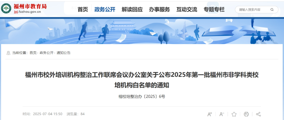 昨天(7月4日),福州市校外培训机构整治工作联席会议办公室公布2025年第一批福州市非学科类校培机构白名单。