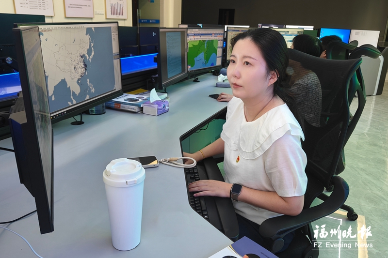 福州市气象台台长陈潇潇紧盯屏幕进行数据收集。