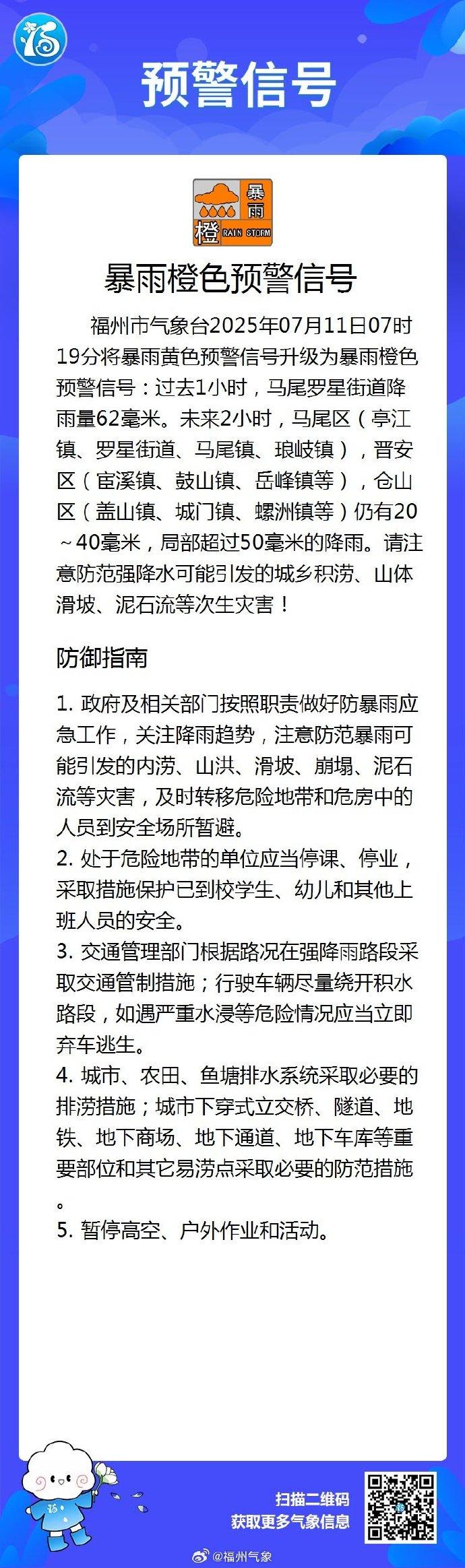 福州市气象台2025年07月11日07时19分将暴雨黄色预警信号升级为暴雨橙色预警信号:过去1小时,马尾罗星街道降雨量62毫米。未来2小时,马尾区(亭江镇、罗星街道、马尾镇、琅岐镇),晋安区(宦溪镇、鼓山镇、岳峰镇等),仓山区(盖山镇、城门镇、螺洲镇等)仍有20~40毫米,局部超过50毫米的降雨。请注意防范强降水可能引发的城乡积涝、山体滑坡、泥石流等次生灾害!
