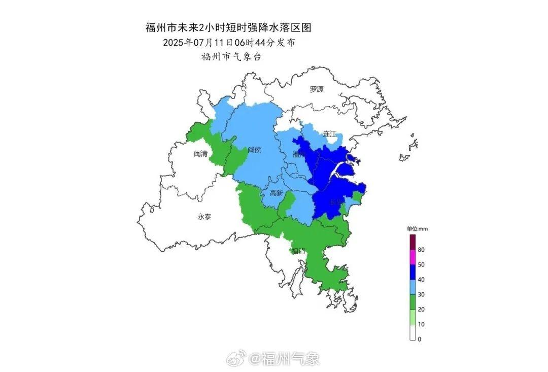 7月11日6时44分,福州市气象台发布提醒,未来2小时(06:40~08:40)福清、永泰将有 20~30毫米降水,闽清、闽侯、仓山、台江、鼓楼、高新将有 30~40毫米降水,连江、马尾、晋安、长乐将有 40~50 毫米降水,请注意防范!