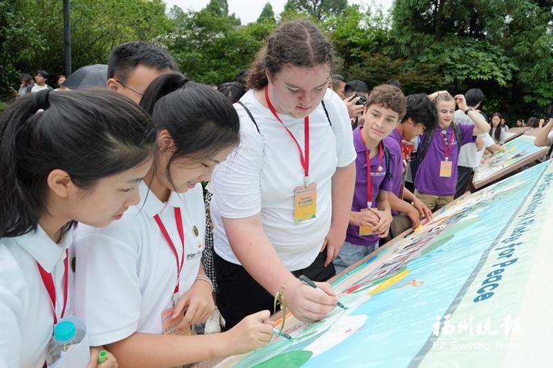 活动现场,中美青少年分为5组,在柳杉王公园的作画区共同为20米长卷填涂色彩。画卷以“和平之约”为主题,巧妙融合福州烟台山、三坊七巷与北京长城、天坛等标志性元素,以茉莉花、月季等市花衔接,勾勒出文化交融的瑰丽画卷。画作完成后,两国青少年共同加盖“和平之约”印章,为这幅画作增添了特别的意义,象征着中美青少年对和平的共同承诺。