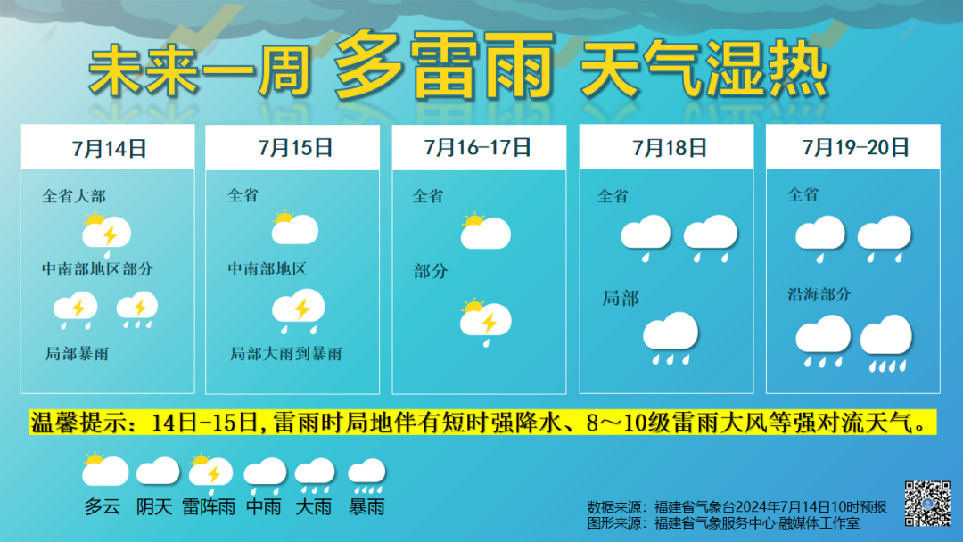 福州14日仍然有大范围的阵雨或雷阵雨,中南部有中到大雨,局部暴雨。15日至16日,部分乡镇有阵雨或雷阵雨,17日雷雨范围又将扩展到全市。大家要注意防范持续降水的叠加效应和地质灾害的滞后效应及可能产生的不利影响。