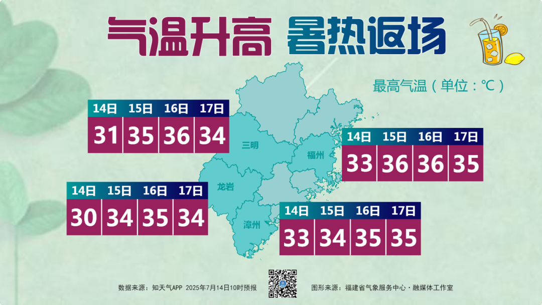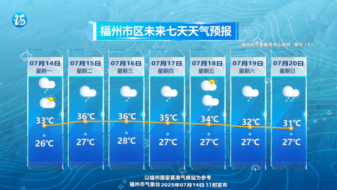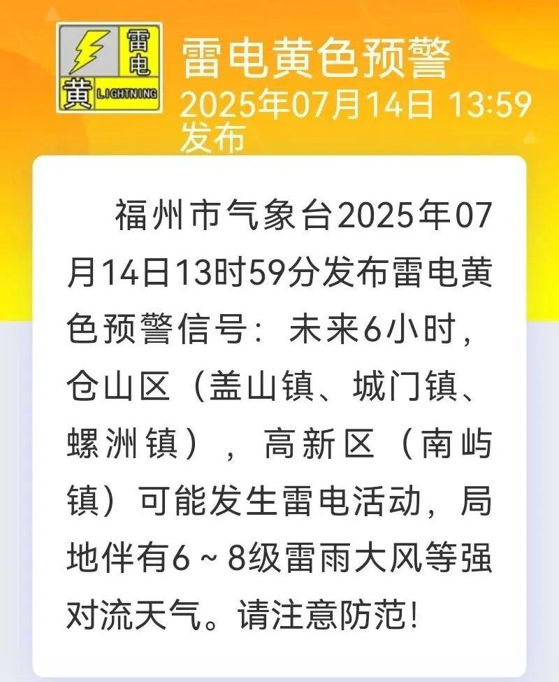 这周,盛夏时节的雨和热都将趋于鼎盛,上周末福州的气温已经开始缓慢上升了,14日市区高温在33℃左右。13时59分福州市气象台发布了雷电黄色预警信号。