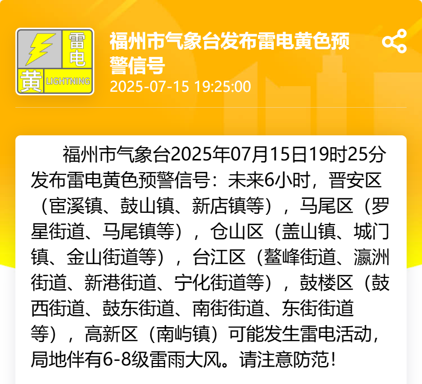 福州市气象台2025年07月15日19时25分发布雷电黄色预警信号:未来6小时,晋安区(宦溪镇、鼓山镇、新店镇等),马尾区(罗星街道、马尾镇等),仓山区(盖山镇、城门镇、金山街道等),台江区(鳌峰街道、瀛洲街道、新港街道、宁化街道等),鼓楼区(鼓西街道、鼓东街道、南街街道、东街街道等),高新区(南屿镇)可能发生雷电活动,局地伴有6~8级雷雨大风。请注意防范!
