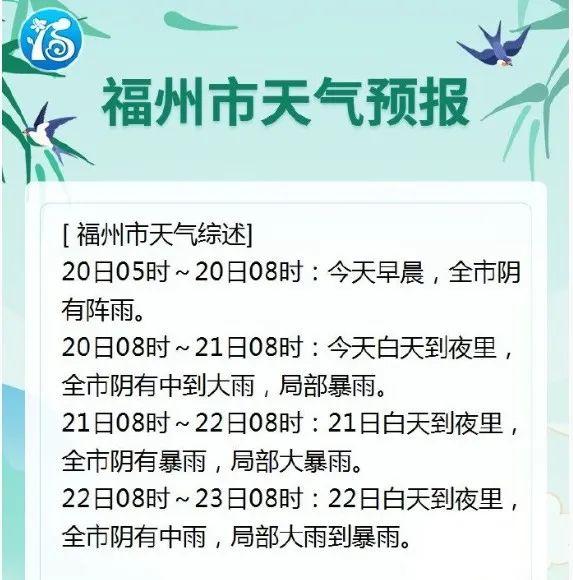20日,全省阴,大部有阵雨或雷阵雨,沿海地区部分大雨到暴雨,局部大暴雨。