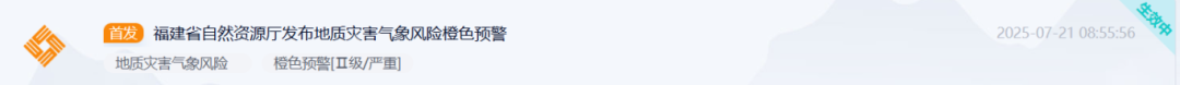 福建省自然资源厅、福建省气象局于7月21日8时55分联合发布地质灾害气象风险橙色预警。