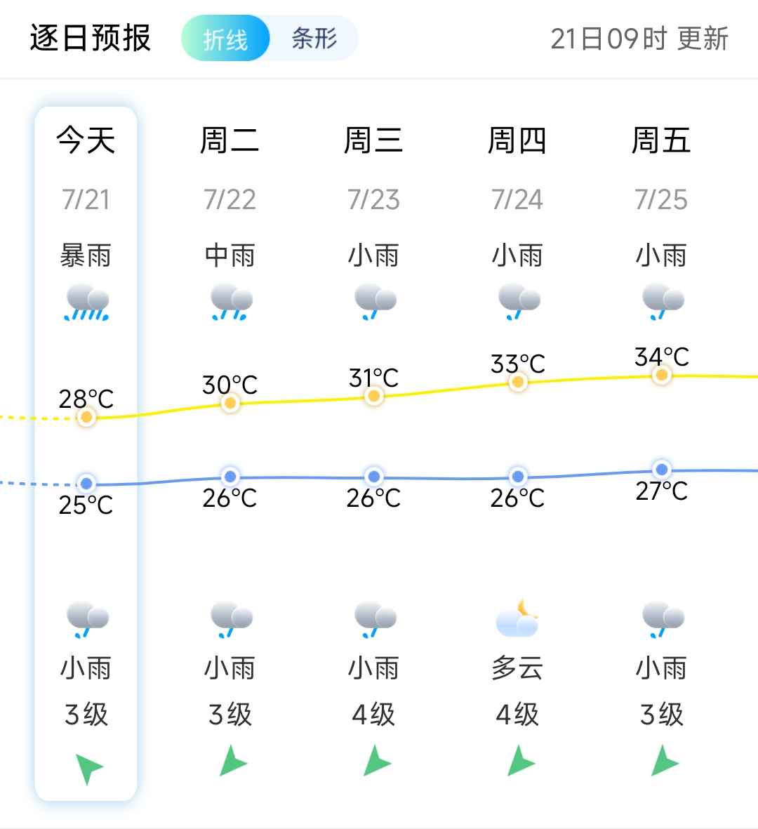 21日白天到夜里,暴雨转大雨,东风3级,气温29~26℃。