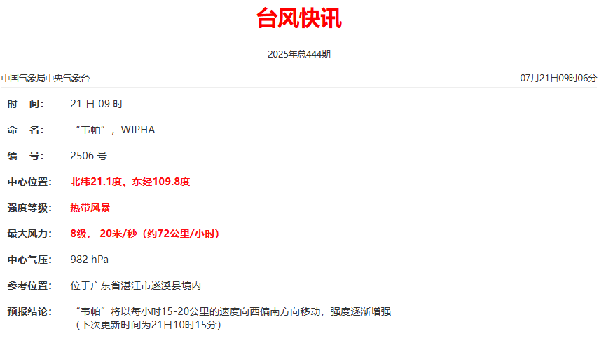 今年第6号台风“韦帕”(热带风暴级)20日07时中心位于广东省湛江市遂溪县境内(北纬21.3度、东经110.0度),中心附近最大风力8级(20米/秒),中心最低气压982百帕。