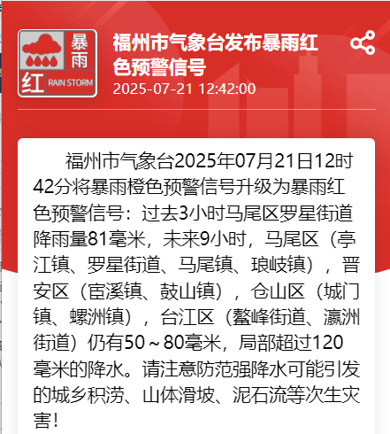 福州市气象台7月21日12时42分将暴雨橙色预警信号升级为暴雨红色预警信号。