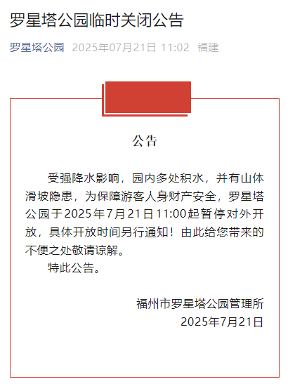 受强降水影响,部分公园临时关闭↓↓