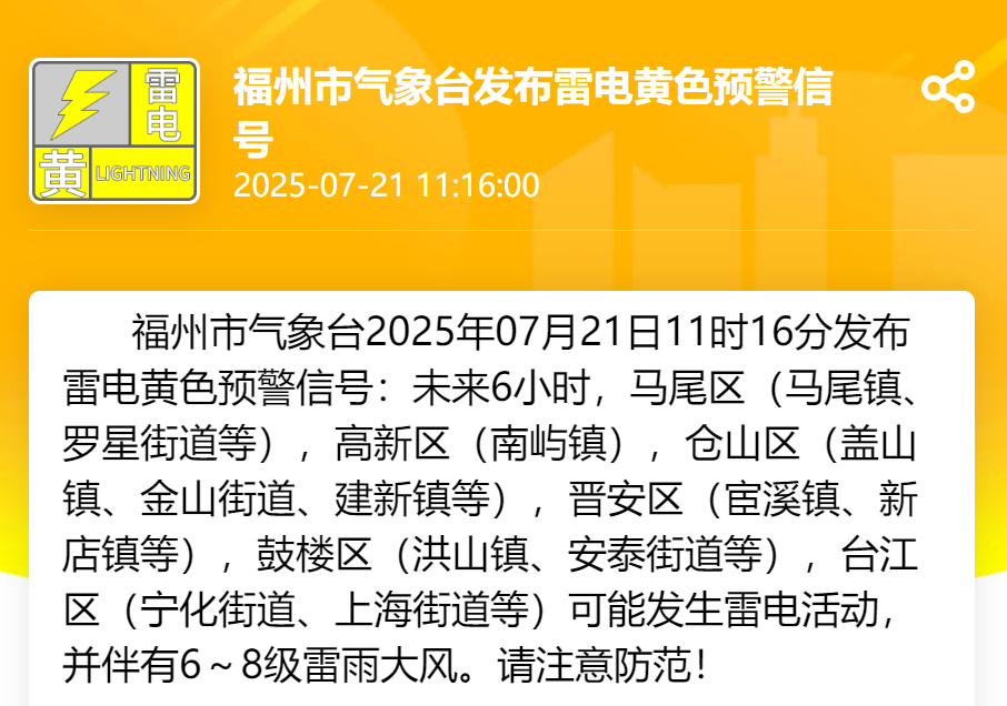 刚刚,福州发布雷电黄色预警信号↓↓