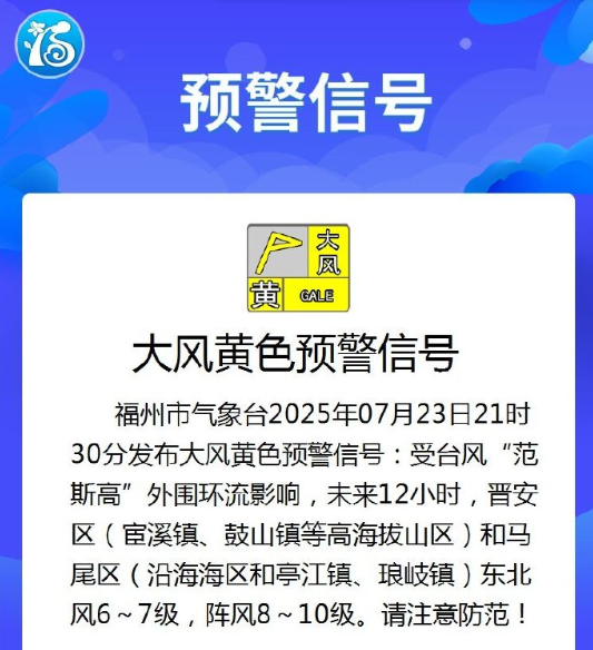 福州市气象台21时30分发布大风黄色预警信号:受台风“范斯高”外围环流影响,未来12小时,晋安区(宦溪镇、鼓山镇等高海拔山区)和马尾区(沿海海区和亭江镇、琅岐镇)东北风6级~7级,阵风8级~10级。请注意防范!