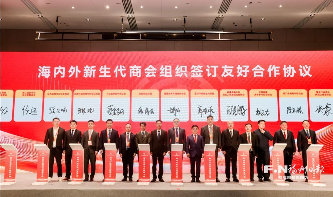 范晓鹏(右六)作为福建省海外及归国人员发展互助协会代表,参与海内外新生代商会组织友好合作协议签订。