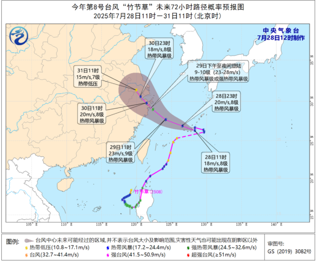 预计,“竹节草”将以每小时15-20公里的速度向西偏北方向移动,即将进入东海东部海面,强度缓慢增强;将于29日下午到夜间在浙江北部到江苏南部一带沿海登陆(23-28米/秒,9-10级,热带风暴级或强热带风暴级),登陆后强度缓慢减弱。