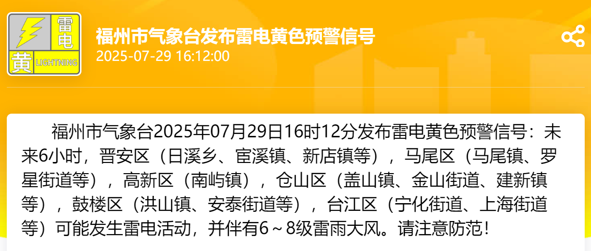 福州市气象台2025年07月29日16时12分发布雷电黄色预警信号:未来6小时,晋安区(日溪乡、宦溪镇、新店镇等),马尾区(马尾镇、罗星街道等),高新区(南屿镇),仓山区(盖山镇、金山街道、建新镇等),鼓楼区(洪山镇、安泰街道等),台江区(宁化街道、上海街道等)可能发生雷电活动,并伴有6~8级雷雨大风。请注意防范!