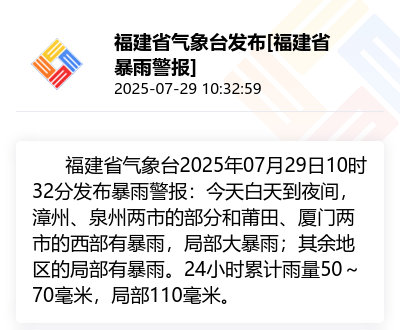 福建省气象台2025年07月29日10时32分发布暴雨警报:29日白天到夜间,漳州、泉州两市的部分和莆田、厦门两市的西部有暴雨,局部大暴雨;其余地区的局部有暴雨。24小时累计雨量50~70毫米,局部110毫米。