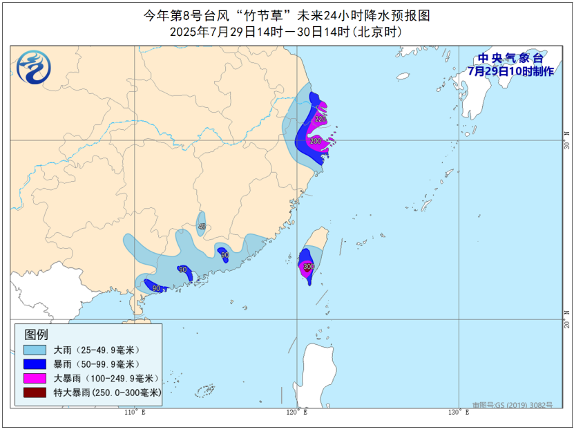 降水预报:7月29日14时至30日14时,江苏中南部、上海、浙江中北部、福建东南部、广东、广西东部、台湾岛等地部分地区有大到暴雨,其中,江苏东南部、上海、浙江东北部、台湾岛南部等地部分地区有大暴雨,局地特大暴雨(250~300毫米)。