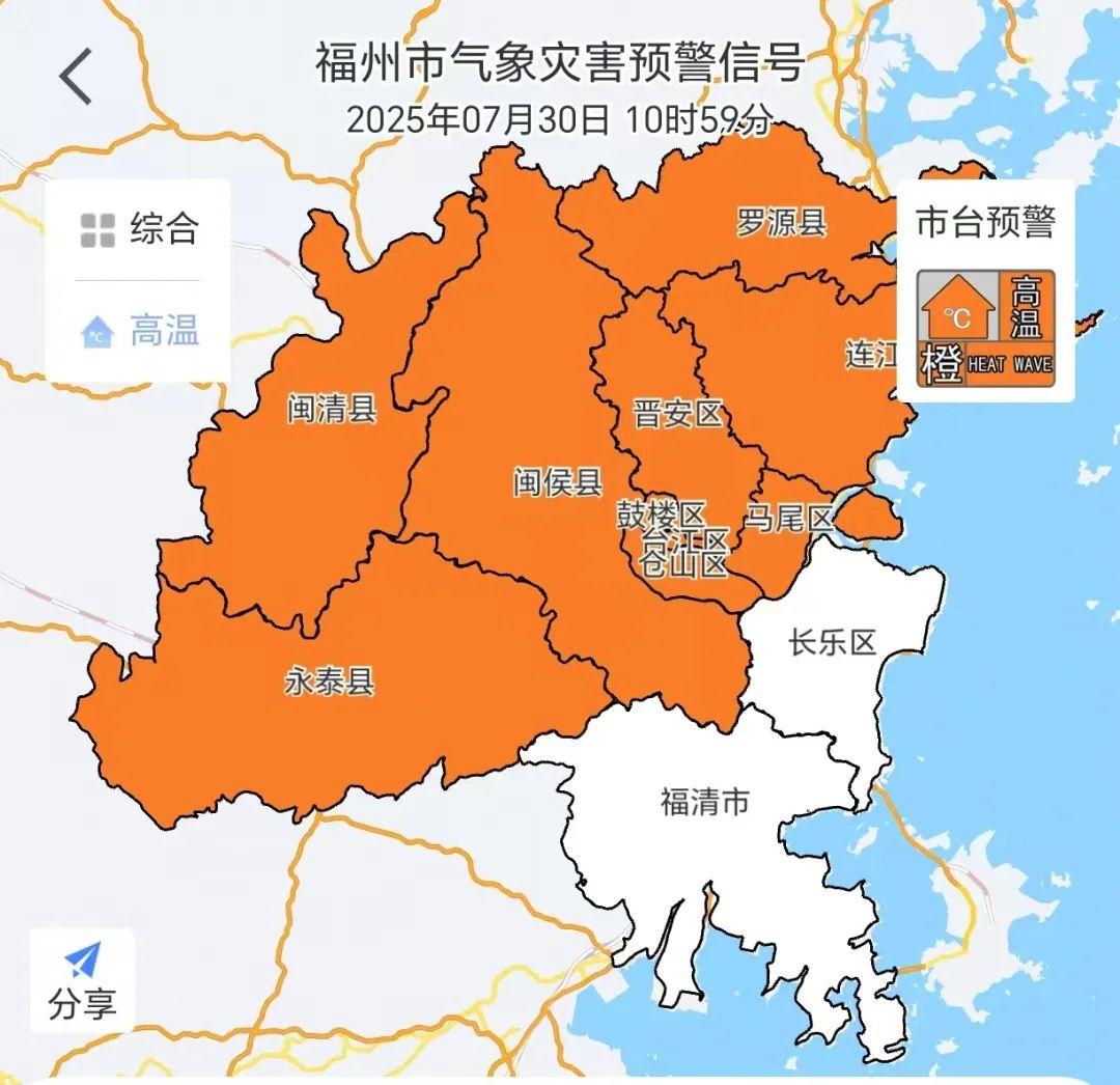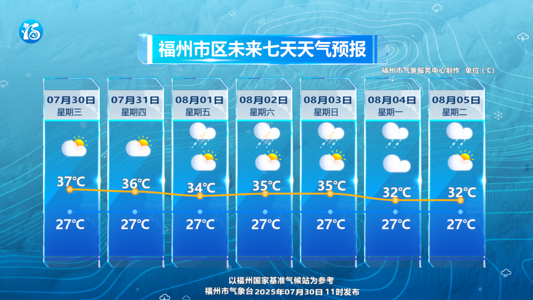 福州今天还发布了高温橙色预警,未来三天,市区的高温都在35℃高温线上下游动,体感较为闷热,多补充水分。
