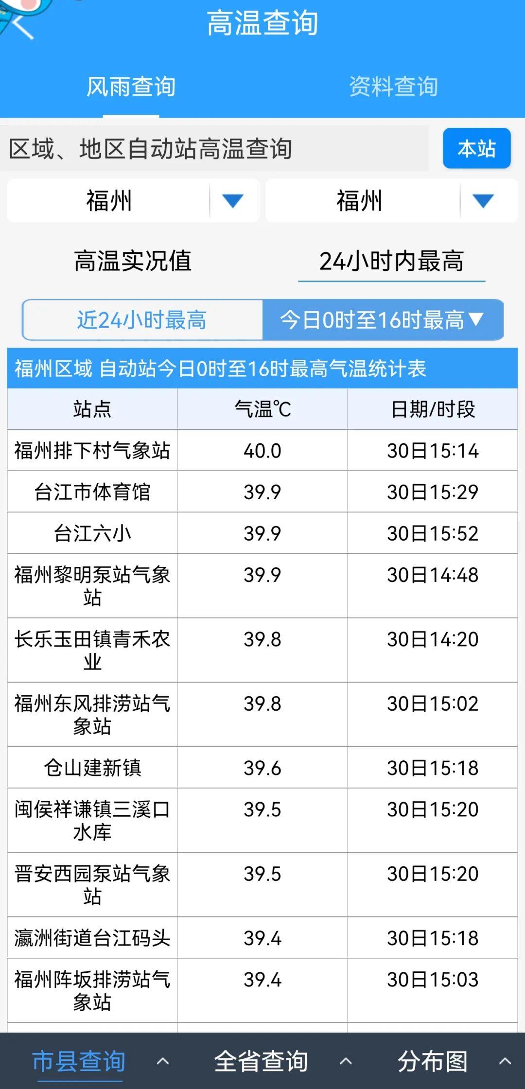 截至今日16时,记者查询知天气App发现福州多个气象站点最高温突破39℃,福州排下村气象站点还测出40℃高温。