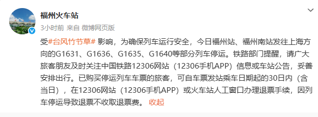 受台风“竹节草”影响,为确保列车运行安全,今日福州站、福州南站发往上海方向的G1631、G1636、G1635、G1640等部分列车停运。