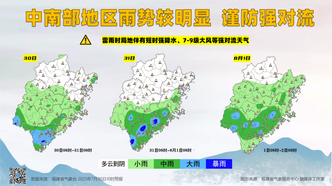 31日白天到夜里,西南风5~6级阵风7~8级。天气多云到阴,午后到夜里部分海区有阵雨或雷阵雨,局部中到大雨。
