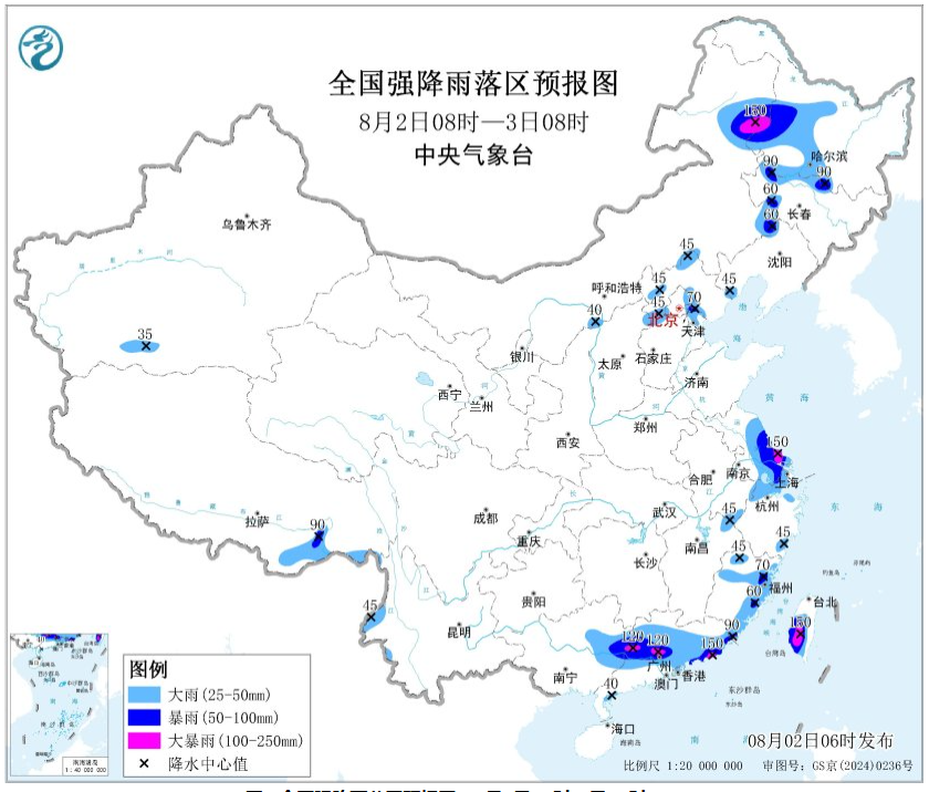预计,8月2日8时至3日8时,内蒙古中东部、黑龙江中西部、吉林西部、辽宁北部和西南部、山西北部、河北中北部、北京东北部和西南部、天津中北部、江苏中南部和东部、上海中西部、浙江北部和东南部、安徽南部、江西东北部、福建北部和东部、广东中北部和东部、广西东部、云南西部、台湾岛等地的部分地区有大到暴雨,其中,内蒙古东北部、黑龙江西部、江苏东南部、广东中北部和东南部沿海、台湾岛中南部等地局地有大暴雨(100~150毫米)。上述部分地区伴有短时强降水(最大小时降雨量20~50毫米,局地可超过70毫米)。内蒙古东部、东北地区西部、华北中西部、江淮东部、华南东部等地的部分地区将有8级以上雷暴大风或冰雹天气,其中,内蒙古东部、黑龙江西南部、吉林西部等地局地将有10级以上雷暴大风,最大风力可达11级以上。