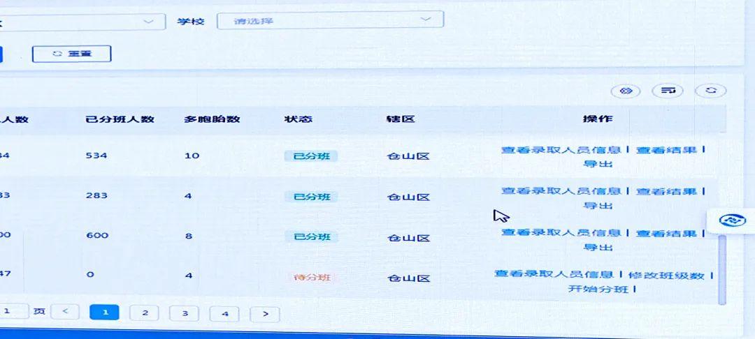 活动现场,按照每班总人数、学生男女比例等均衡原则,各区教育局工作人员轮流在系统上对每所学校进行分班操作。系统后台已提前有序排列好各校学校名称、学校代码、班级数、总人数、多胞胎数等信息,工作人员现场确认具体信息后只需一键点击“开始分班”,短短2—3秒内,各个班级的学生分配情况便迅速生成。