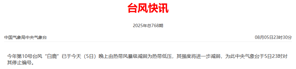 据中央气象台最新消息,今年第10号台风“白鹿”已于5日晚上由热带风暴级减弱为热带低压,其强度将进一步减弱,为此中央气象台于5日23时对其停止编号。