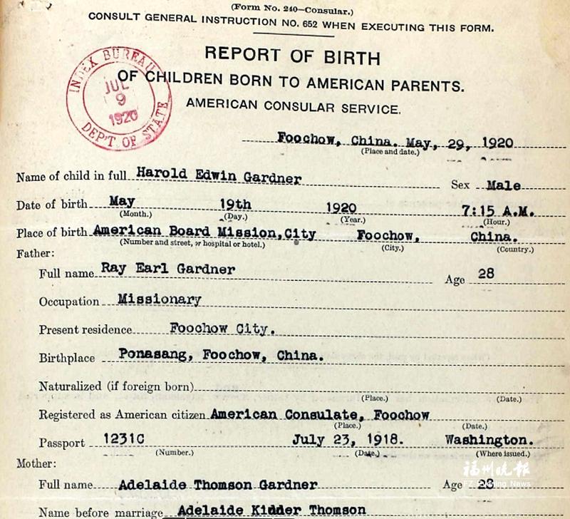 哈罗德·加德纳的出生证明,显示他出生在福州。(资料图片)