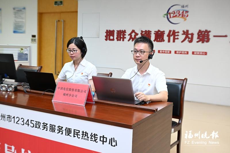 中国电信福州分公司副总经理肖凌(右)接听12345热线。记者 叶诚 摄
