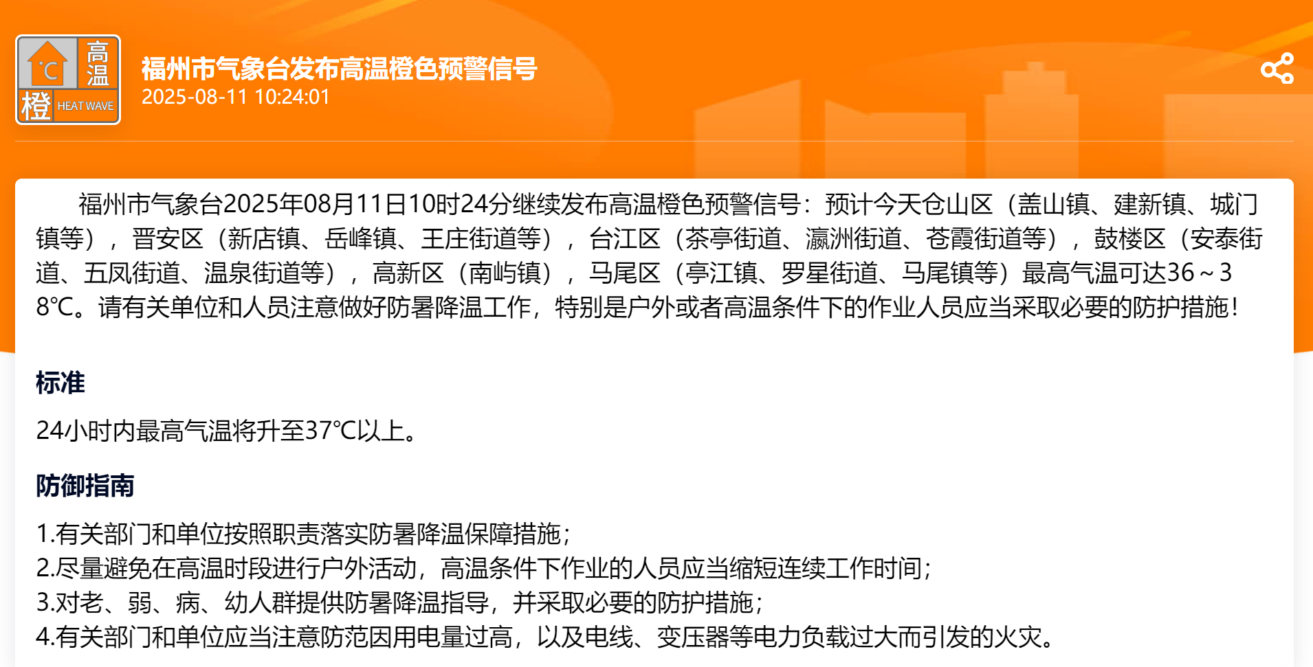 福州市气象台2025年08月11日10时24分继续发布高温橙色预警信号:预计今天仓山区(盖山镇、建新镇、城门镇等),晋安区(新店镇、岳峰镇、王庄街道等),台江区(茶亭街道、瀛洲街道、苍霞街道等),鼓楼区(安泰街道、五凤街道、温泉街道等),高新区(南屿镇),马尾区(亭江镇、罗星街道、马尾镇等)最高气温可达36~38℃。请有关单位和人员注意做好防暑降温工作,特别是户外或者高温条件下的作业人员应当采取必要的防护措施!