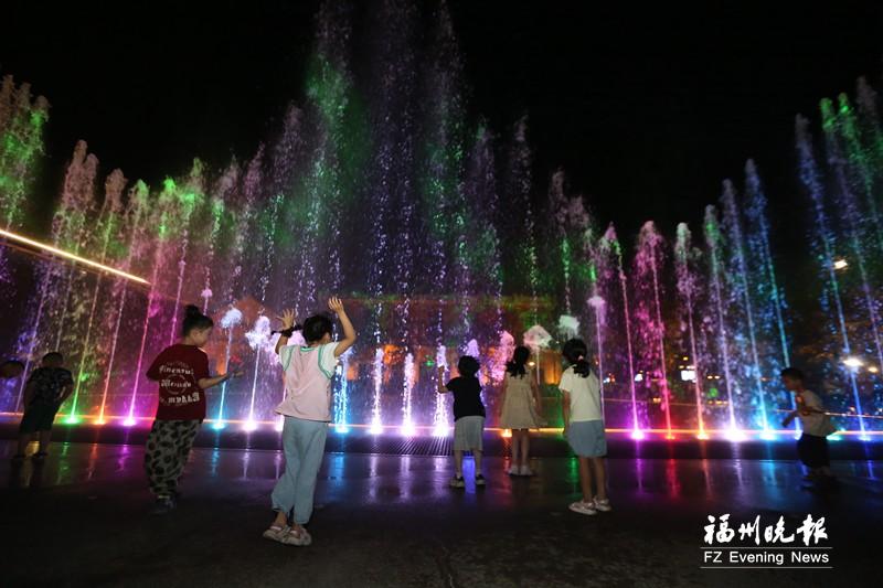 在船政文化园区,孩子们观看音乐喷泉。
