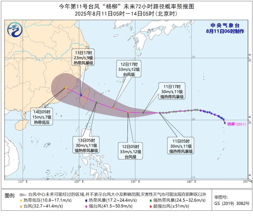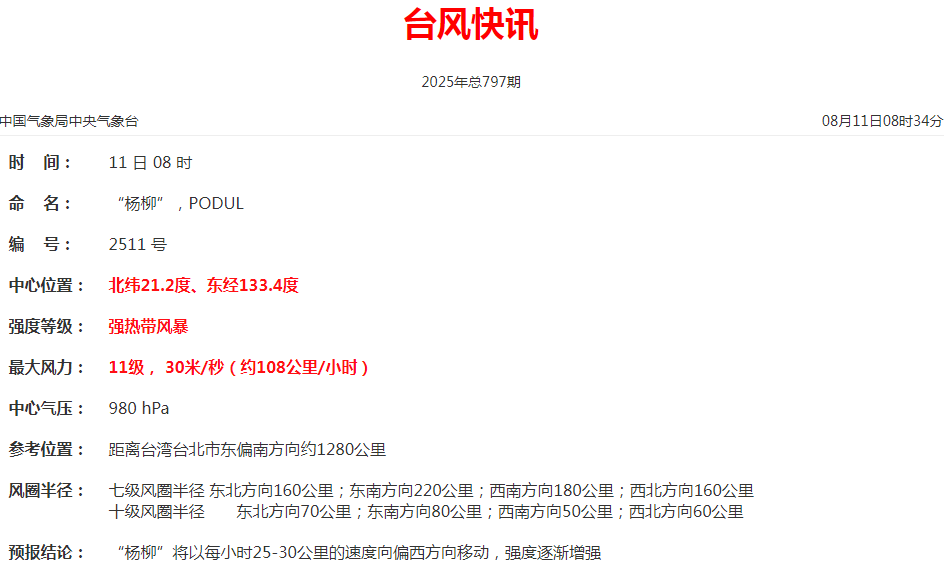 今年第11号台风“杨柳”(强热带风暴级)的中心11日5时位于台湾花莲市东偏南方向,大约1340公里的西北太平洋洋面上,就是北纬21.2度、东经134.3度,中心附近最大风力11级(30米/秒),中心最低气压980百帕。