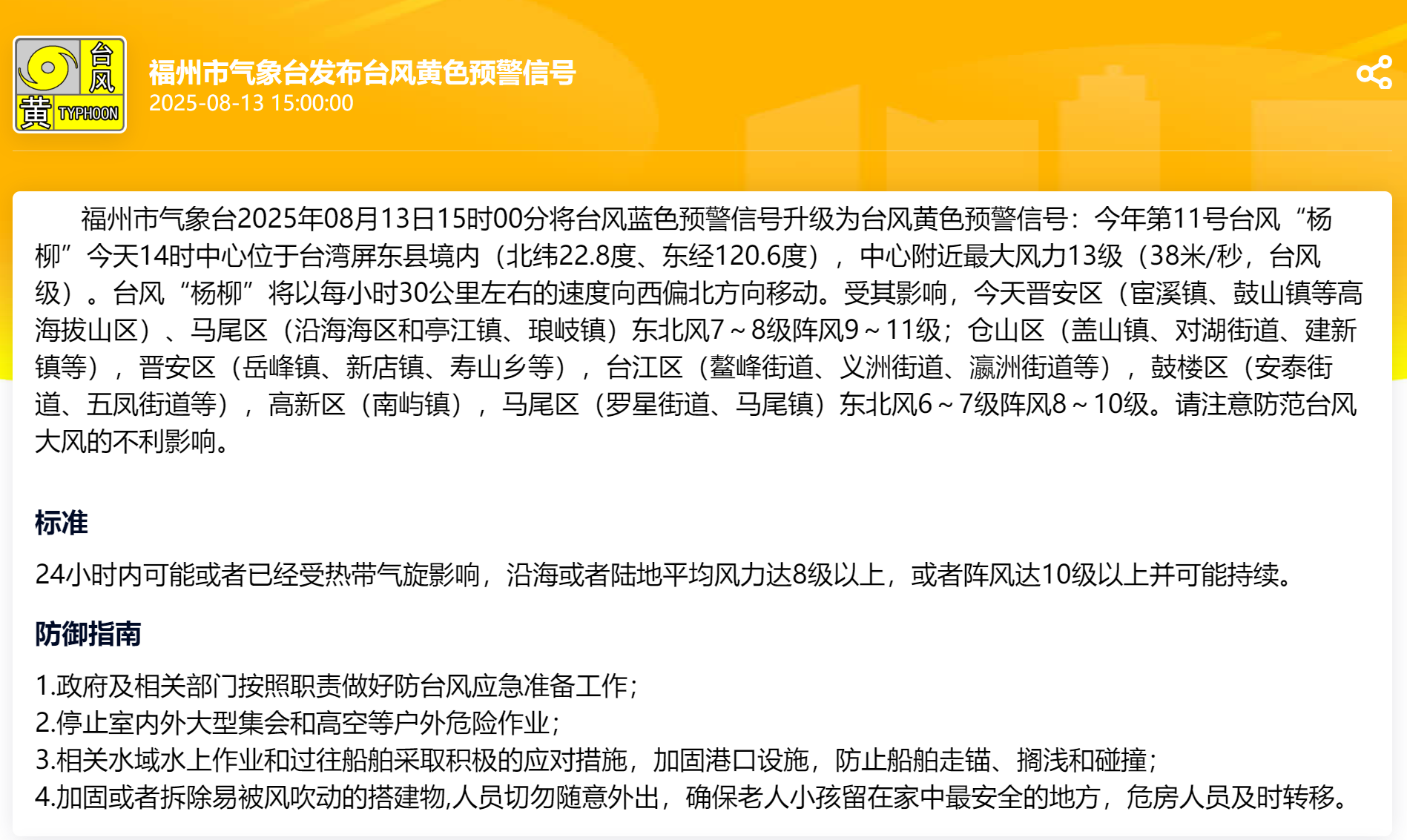福州市气象台2025年08月13日15时00分将台风蓝色预警信号升级为台风黄色预警信号:今年第11号台风“杨柳”今天14时中心位于台湾屏东县境内(北纬22.8度、东经120.6度),中心附近最大风力13级(38米/秒,台风级)。台风“杨柳”将以每小时30公里左右的速度向西偏北方向移动。受其影响,今天晋安区(宦溪镇、鼓山镇等高海拔山区)、马尾区(沿海海区和亭江镇、琅岐镇)东北风7~8级阵风9~11级;仓山区(盖山镇、对湖街道、建新镇等),晋安区(岳峰镇、新店镇、寿山乡等),台江区(鳌峰街道、义洲街道、瀛洲街道等),鼓楼区(安泰街道、五凤街道等),高新区(南屿镇),马尾区(罗星街道、马尾镇)东北风6~7级阵风8~10级。请注意防范台风大风的不利影响。