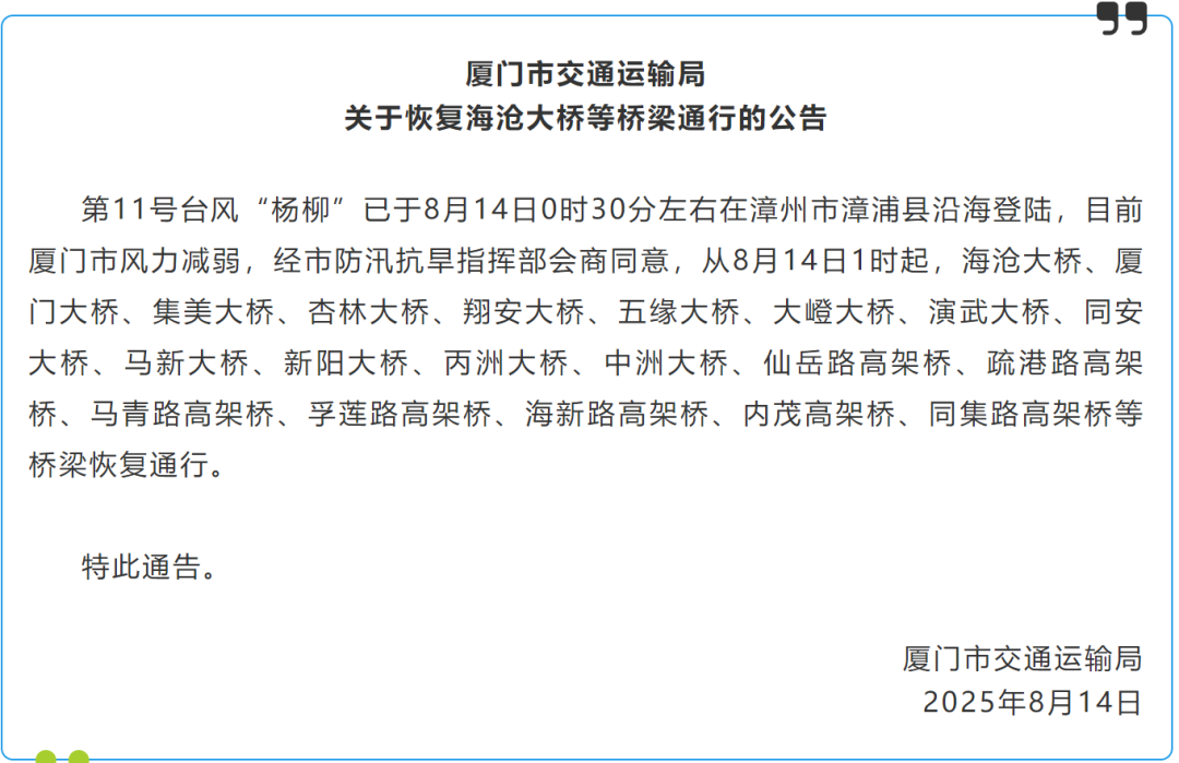 厦门发布公告,海沧大桥等桥梁恢复通行。