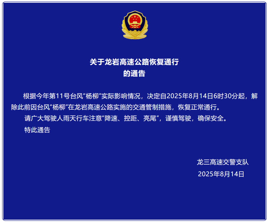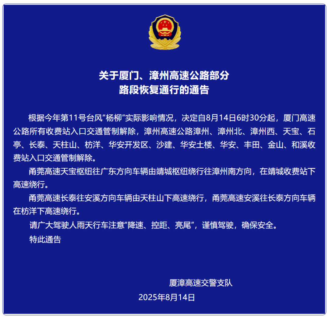 根据台风“杨柳”实际影响情况,厦门、漳州、泉州、龙岩高速公路部分路段恢复通行。