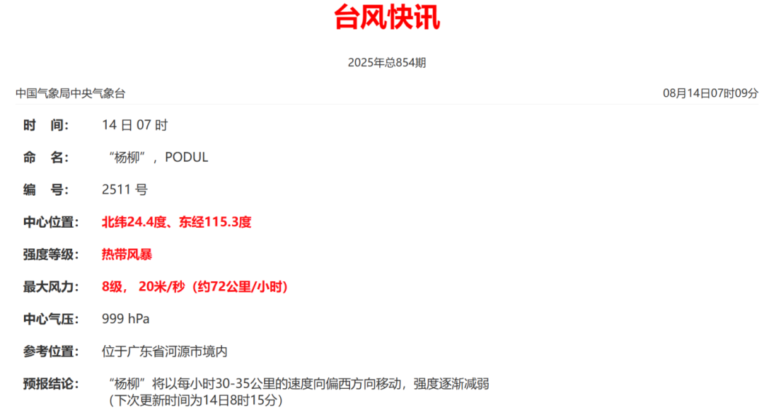 14日7时,台风“杨柳”位于广东省河源市境内,预计将以每小时30~35公里的速度向偏西方向移动,强度逐渐减弱。