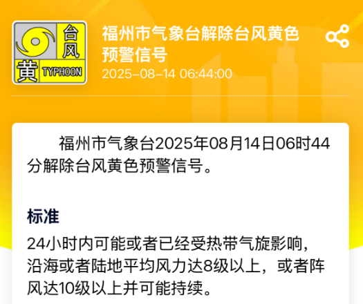 福州市气象台8月14日6时44分解除台风黄色预警信号。